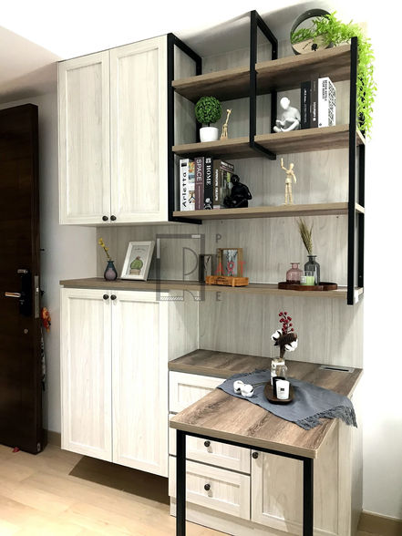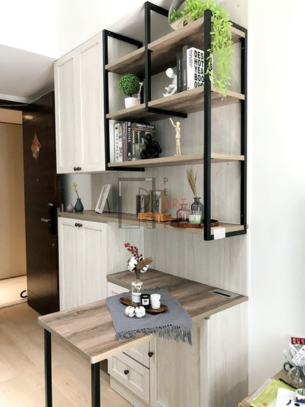 屋主之前用的摺疊式餐枱,趟開後就不會再收埋;經商議後決定在組合櫃中訂造L形餐枱,既可儲物亦較安全穩固,一家三口或朋友聚餐簡單容易。
